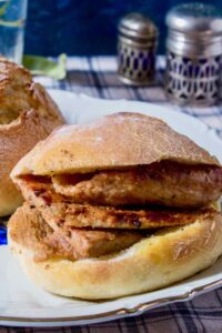 - Dans un plat creux, disposer les escalopes de porc, l’ail coupé en morceaux, saler (gros sel) et poivrer selon votre goût.