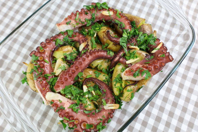 Ce plat typique du Portugal est composé de poulpe grillé et de pommes de terre au four.