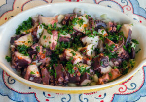 - Découper le reste du poulpe en morceaux et les mettre dans un plat.
